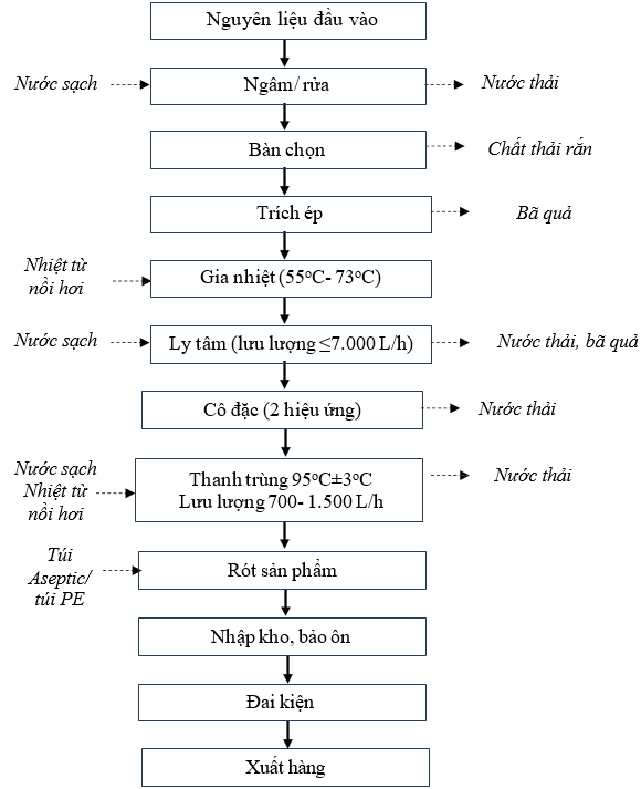 + Sản phẩm nước cô đặc, puree công suất 5.000 tấn sản phẩm/năm: nước dứa cô đặc, nước cam cô đặc, nước đào cô đặc, nước chuối cô đặc, nước lạc tiên cô đặc, nước vải cô đặc, lạc tiên puree, xoài puree, vải puree, dưa hấu puree…