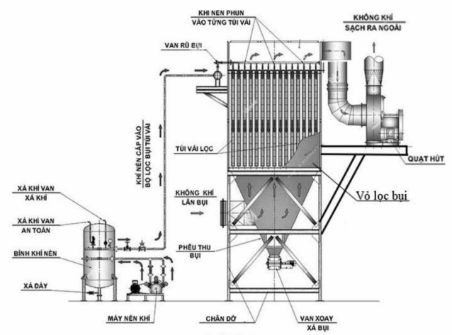 + Trong suốt quá trình làm sạch của hệ thống túi vải thì bụi sẽ rơi vào phễu và được chuyển đi thông qua các hệ thống xả rồi tiếp tục được vận chuyển dưới đáy lọc bụi (gồm van quay, vít tải) về bồn chứa.