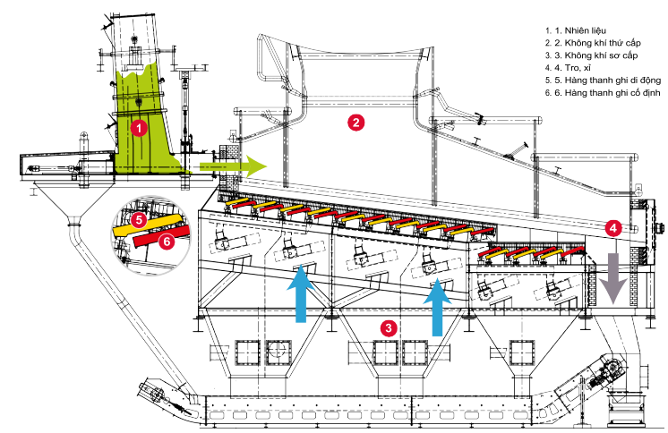 Hệ thống đốt ghi lưới làm mát bằng không khí và nước do Oschatz Power GmbH cung cấp đảm bảo tót quả xuất sắc với hầu hét các loại nhiên liệu rân - đặc biệt là trong dải nhiệt lượng thấp với nhiệt trị từ 6.000 kJ/kg. Thông qua việc làm nóng trước mục tiêu không khí đốt với nguồn cung cấp không khí được điều chỉnh, nhiên liệu được chuẩn bị để đánh lửa và đốt cháy. Điều này cho phép sử dụng nhiều loại nhiên liệu.