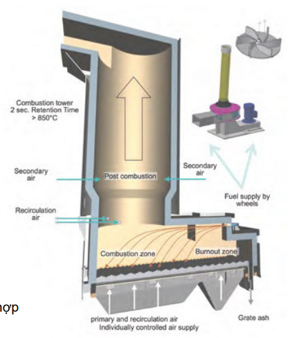 Quá trình đốt cháy được kiểm soát với bộ điều khiển hỏa lực hiện đại. Chất lượng quá trình đốt cháy được kiểm soát bằng các biện pháp can thiệp kiềm soát tùy thuộc vào nhiệt độ buồng đốt và phép đo 02, trong đó những điều này ảnh hưởng đến lượng không khí thứ cấp và tuần hoàn. Điều này đảm bảo hiệu suất đốt cháy ổn định và đốt cháy tốt. Hệ thống đốt với lưới di động và kiểm soát đốt cho phép giảm lượng khí thải đặc trưng của quá trình đốt xuống dưới các giá trị giới hạn cho phép về mặt pháp lý.